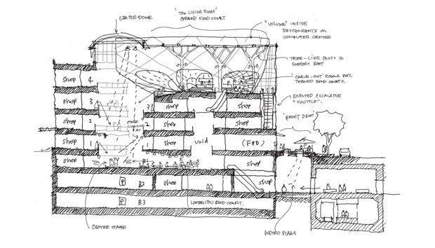 萬谷建筑設計團隊提倡的【都市客廳】是把策劃運營上的變化,變現在建筑設計室內公共空間設計上,直接反應打造出激動人心的建筑外觀,從而進一步提高運營效果的設計手法。